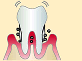 歯肉だけに起きていた炎症がさらに進行し歯根の方に侵入してく。歯槽骨と歯根膜を溶かしながら細菌が侵入してくると歯肉は歯根と離れていく。歯肉の組織が犯されてしまうため歯根に接着している事が出来なくなる。歯周病原菌は嫌気性菌であるため炎症は歯根の先の方へ進んで歯がぐらぐらになり最後は抜け落ちる。